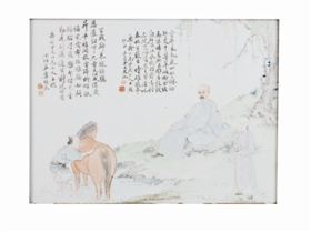 淺絳《浴馬圖》瓷板畫,長42.5、寬34厘米。在柳陰花枝下,河塘岸邊,靜坐著一位精神矍鑠、面目清瘦的老者,人物開相寫實(shí)而古樸。淺水中站立的駿馬,健壯而溫順。兩名童子簡筆勾勒,卻生動(dòng)而傳神,一位童子手持水煙袋靜心守候,另一辛勤勞作。畫面刪繁就簡,主次分明,文人氣息撲面而來。