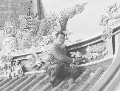 在東山縣前樓鎮(zhèn)岱南村新擴建的媽祖廟厝頂上,孫麗強又完成一項剪瓷雕佳作