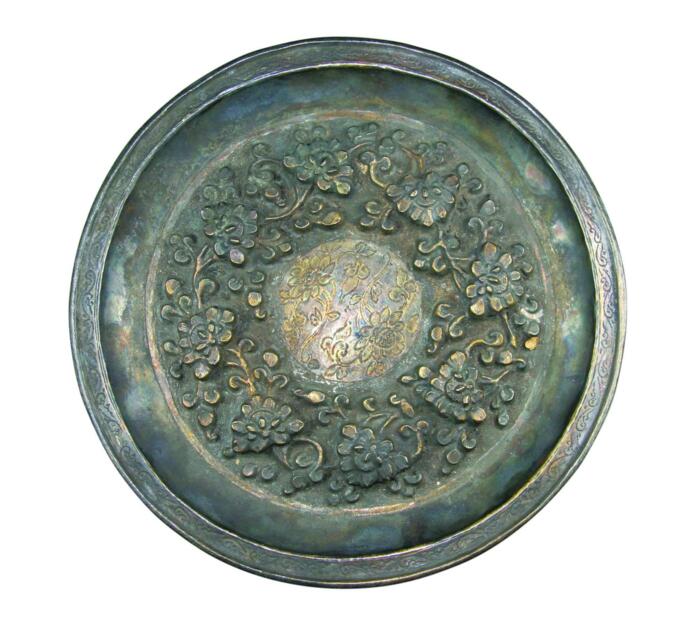 底部銀托盤(圖2),直徑約17厘米,亦使用錘揲與鏨刻工藝制成,盤心為一對(duì)平面陰線刻牡丹圖案,周圍錘凸出八朵高浮雕的纏枝牡丹環(huán)繞,盤口邊沿為一圈細(xì)線刻裝飾,銀托盤整體紋飾造型風(fēng)格與銀盞一致。銀托盞雖歷經(jīng)千年,其表面依稀留有當(dāng)時(shí)鎏金的痕跡。