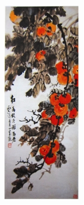 圖1,《紅柿圖》,紙本,彩繪?v162、橫45厘米。圖繪兩枝累累紅柿,瑪瑙般成串熟透的大柿子把枝頭壓彎,從上直到下方。在左側(cè)中下方落款:“紅在心頭甜到老。一九五八年春月,星五畫。”下鈐紅文印“星五”,右下角還鈐一方白文收藏印。