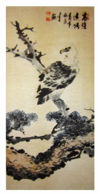圖2,《高瞻遠(yuǎn)矚圖》,紙本,淡彩?v160、橫46厘米。畫一只蒼鷹棲息在枯松枝上,作回頭顧盼同伴飛來。右上方落款:“高瞻遠(yuǎn)矚。壬戌年秋月,星五畫。”下鈐紅文印“崔氏”“星五”。壬戌年,即民國十一年(1922)。