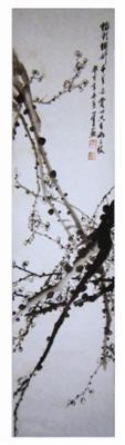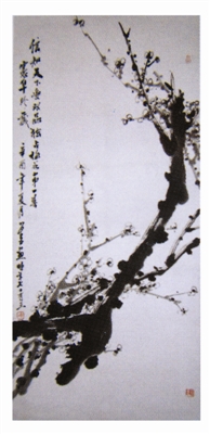 圖3,《梅花獨(dú)尊圖》,紙本,墨筆?v163、橫42厘米。從左下角伸出一枝老干向右上角彎弓折左,不少嫩枝上梅花朵朵綻開。右上側(cè)落款:“信知天下無雙品,獨(dú)占梅花第一尊。辛酉年夏月,星五時(shí)年七十有五。”下鈐紅文印“星五”。辛酉年,即1981年。