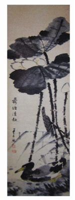 圖4,《荷塘清和圖》,紙本,墨筆。縱163、橫39厘米。上方被三面田田的荷葉占滿,一枝盛開的荷花躲在荷葉間,一枝花苞在右側(cè)荷葉下;下方一只野鴨在荷塘?xí)秤。左?cè)下方落款:“荷塘清和。星五畫。”下鈐紅文印“崔氏”“星五”。