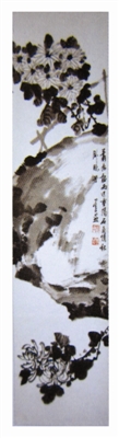 圖6-4,巖菊屏,中部突兀的大山巖占了大半畫面,其上一欄盛開的菊花,山巖下從右伸出一枝盛開的菊花,上下呼應(yīng),很有神氣。右側(cè)中部巖石上落款:“蕭條報(bào)雨過重陽,石角懷秋臥晚涼。星五畫。”下鈐紅文印“星五”、白文印“崔氏”。