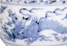 明代洪武時(shí)期高足碗,一反元代碗形較淺、高足較高的形制,轉(zhuǎn)變?yōu)槠魃磔^深、高足略短的新造型,之后永樂(lè)、宣德繼之。臺(tái)北故宮博物院藏有洪武及器心帶“永樂(lè)年制”四字篆印款、相同形制的甜白釉高足碗。此器口、足的纏枝靈芝紋,及高足上的纏枝蓮紋,均先勾繪花朵輪廓線,花瓣邊緣及花心留白,內(nèi)層染青,此一特殊描繪技法為洪武青花、釉里紅紋飾的獨(dú)有特征。而帶翼三爪應(yīng)龍紋飾殊為特別,龍身魚(yú)尾,與一般所見(jiàn)洪武細(xì)身龍紋有所不同。此器的形制、灰青釉色,以及花邊留白的特征,都呈現(xiàn)出洪武青花的特色。目前為止,傳世或者御窯遺址出土均無(wú)發(fā)現(xiàn),極為珍稀。