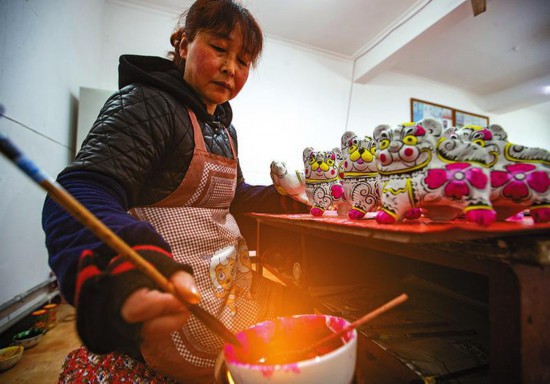 在六營村胡新明泥塑傳承研習(xí)所里,記者看到忙碌而熱鬧的景象。工人們正有條不紊地進(jìn)行著泥塑的翻坯、彩繪等工作。在產(chǎn)品展示大廳,不時(shí)有上門參觀和購買泥塑的游客,工作人員忙得不亦樂乎。胡新明說:“現(xiàn)在泥塑作品更加多元化,色彩斑斕,線條明快。泥塑藝術(shù)也要在傳承中不斷創(chuàng)新。”