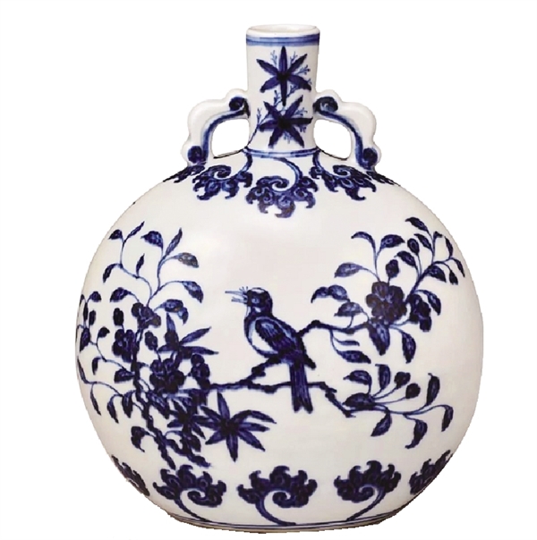 “一只鳥(niǎo)’是指本次東京中央春拍夜場(chǎng)的封面——清雍正青花喜上眉梢抱月瓶,以及其所代表的精品瓷器薈萃。”項(xiàng)立平告訴記者,抱月瓶器型源于阿拉伯銅器,明代永樂(lè)時(shí)成功將其運(yùn)用于瓷器器型,成為明清御瓷中的名品。清代雍正皇帝御瓷追摹永樂(lè)青花花費(fèi)了不少功夫。