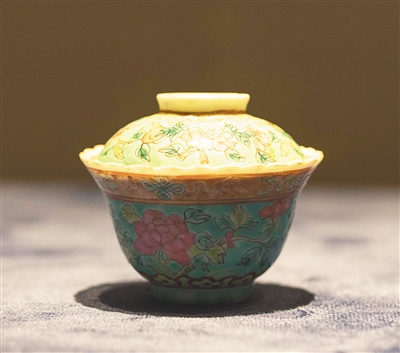 “招財進(jìn)寶”款松石綠地粉彩牡丹紋蓋碗