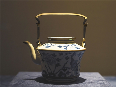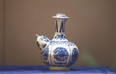 幾件青花軍持——乳房狀注口瓷水壺花紋淡雅別致,線條圓潤。據(jù)介紹,軍持最初使用跟印度佛教密切相關(guān)。13世紀(jì)中后期伊斯蘭教傳入東南亞并得到進(jìn)一步發(fā)展后,軍持繼續(xù)為當(dāng)?shù)厝嗣袼谩?ldquo;軍持這種器型在當(dāng)時的中國國內(nèi)是不多見的,一般都是為東南亞國家專門訂制。當(dāng)時,東南亞人民對這一器物需求量大,所以,今天我們能夠在東南亞地區(qū)發(fā)現(xiàn)大量遺存。”故宮博物院器物部研究館員、該展策展人董健麗說。