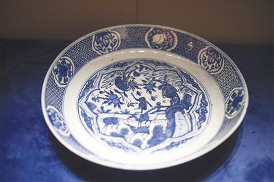 尺寸頗大的瓷盤是展覽中出現(xiàn)較多的瓷器。仔細(xì)觀察,許多瓷盤上還寫著阿拉伯文。據(jù)介紹,東南亞一帶的聚會或宴會上,有一些以席鋪地,大盤置于席中,盤中盛滿米飯、魚肉并澆咖喱湯汁,大家圍坐一起,以手撮飯而食。通常情況下,宴會上四至八人共用一個大盤,可見大盤盛裝飯量之大。傳入東南亞的陶瓷飲食器具,多為宴會時使用的諸如“克拉克瓷”的大盤。
