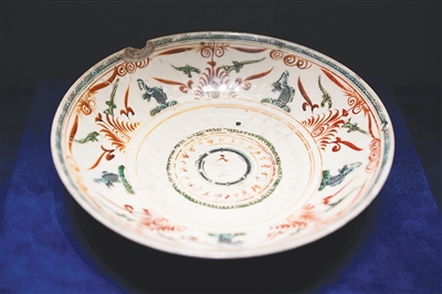 展品中還有一件漳州窯紅綠彩魚藻羅經(jīng)文大盤,將羅盤紋樣繪制在盤的內(nèi)底。據(jù)介紹,當(dāng)時,羅盤上還應(yīng)置有羅針,整件瓷盤類似針碗。這件實用瓷器也充分反映出依海而生的東南亞人民對指南針的崇敬之情,展示出源遠(yuǎn)流長的航海文化。