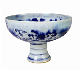 高足碗、杯是元代開始流行的器型,明清各朝均有燒造。從傳世與出土的景德鎮(zhèn)窯制品看,元代高足碗、杯的制作工藝與明清有明顯的區(qū)別,元代的器身與高足采用泥胎相接,故足內(nèi)頂端無釉處留有呈乳釘狀凸起的粘接痕,明清的器身與高足采用釉料接胎,故高足內(nèi)頂端光滑平整。