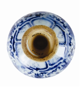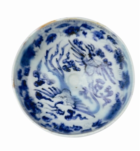 此高足碗大口微斂,弧形壁,竹節(jié)狀高足中空,與元代甚為流行的撇口、圓腹、高足的樣式相比,此器形制比較少見。碗內(nèi)外滿繪紋樣,內(nèi)里飾一對穿梭于云間的鳳凰,一雄一雌,一鳳一凰,雄鳳頭頂一只孔雀羽翎,翩翩起舞;雌凰與其遙望,頭部無羽翎,尾部為三羽紋飾。主題圖案流暢自然,生動而有情趣,四周繪纏枝牡丹紋;外壁畫纏枝牡丹、蓮花紋,近底處繪一周變體蓮瓣紋。通體釉色白中閃青,色料濃淡不勻,青色中有黑斑點,有自然暈散現(xiàn)象,具有“蘇泥勃青”的特點。在入窯燒造過程中,可能由于青色顏料不能適應(yīng)過高的火候,碗口內(nèi)壁形成鋸齒狀的“冰掛”,造成青花的暈散嚴重,紋樣略顯模糊,但碗內(nèi)的雙鳳紋仍不失精美流暢之感。尤其值得稱道的是,高足碗、杯的裝飾一般注重外壁,內(nèi)底紋飾多裝飾在底心,像此器這樣內(nèi)里滿繪圖案的甚為珍稀。1979年在江西省景德鎮(zhèn)市湖田窯北岸元后期地層也出土過一件青花蓮池鴛鴦紋高足碗,形制與此件十分相似,很大可能是在同一地方燒制的。