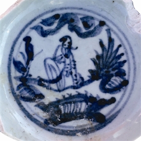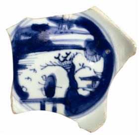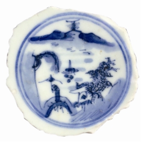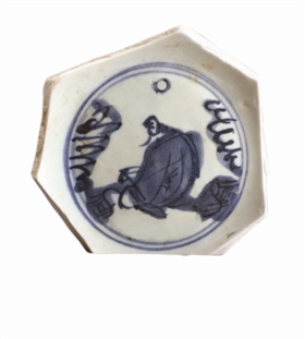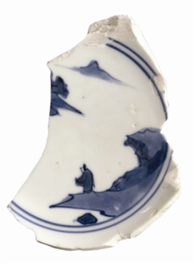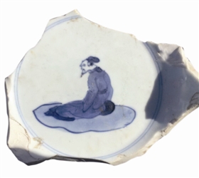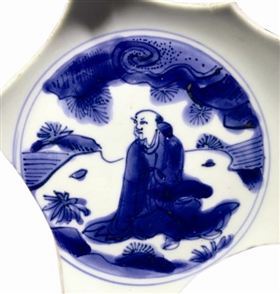 本文要介紹的這組明清時(shí)期青花瓷片上畫的都是“高士”。當(dāng)時(shí)的工匠把筆下線條表現(xiàn)在瓷上,幽谷之中,坐聽(tīng)松風(fēng)泉鳴,全畫空寥寂靜。這讓我想到張大千的“高士圖”,那是他西康之游后的作品。與這些瓷畫相近的,都是高士思想與所游真景簡(jiǎn)筆結(jié)合,或獨(dú)行獨(dú)坐,或絕塵孤思,幽然孤嘯,大有欲往從之游,愿言成獨(dú)往的幽靜境界。