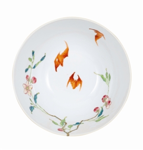筆者要介紹的這件清雍正粉彩過枝福壽雙全碗(見圖),可以說是珍罕之物。此碗繪五壽桃于碗外壁,現(xiàn)在所能知道的其他同類作品均繪六桃,其中四桃于外,內(nèi)壁雙桃。此碗碗身和內(nèi)壁繪五紅蝠,意指洪福齊天,五蝠音同五福,高壽、康寧、富貴、好德、善終。繪蝙蝠倒飛,“倒”音同“到”,為福到之意。此碗繪蟠桃瑞果,花繁葉茂,枝干蜿蜒,敷彩濃淡有致,描繪入微。作品中呈現(xiàn)出情景交融、虛實相生、活躍著生命律動、韻味無窮的詩意空間,這種意韻美是從意義、構(gòu)圖、線性、色彩中共同體現(xiàn)出來的,它們相輔相成。如此精致之品,獨一無二。