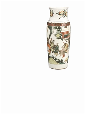 器高36.4、口徑12.1、底徑11.3厘米。侈口,束頸,溜肩,直筒形長腹,平底。器壁較薄,里外施白釉,釉面堅致。彩繪以紅、綠、黃為主,綠釉濃厚瑩潤,黃彩汁潤鮮亮,礬紅深沉顯棗皮紅,具大明彩”韻味。五彩邊緣的白釉處圍有一環(huán)五光十色的光暈,說明彩釉年代古老。