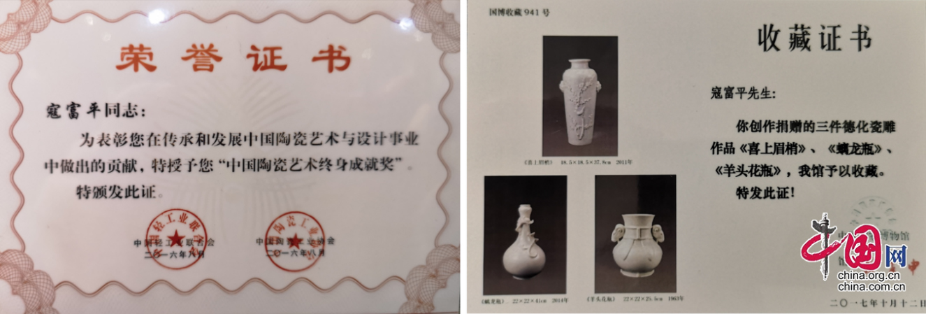 寇富平從事陶瓷研究創(chuàng)作已逾60年,畢生都致力于德化古名瓷“建白瓷”的恢復(fù)研究。馳譽于明代,其特點可用“白中泛黃、溫潤剔透”這八個字概括,為古代“海上絲綢之路”的出口商品之一,并被推為白瓷的代表,自清代中晚期以來,其燒制技術(shù)逐漸失傳。1959年福建省委決定恢復(fù)德化縣的品種研發(fā)生產(chǎn),剛從景德鎮(zhèn)陶瓷學(xué)院畢業(yè)的寇富平被分配到省城的研究所工作,參與德化明朝的恢復(fù)研究。工作持續(xù)到1963年,終于拿出了研制成果。經(jīng)過專家與古瓷片比較,復(fù)原出來的白瓷在質(zhì)量上得到了認可。