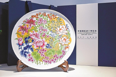 據(jù)了解,今年接到進博會組委會給上海陶瓷科技藝術館的“任務”后,他特意選擇以瓷盤來呈現(xiàn)“百花齊放”之美,寓意中國開放、包容,擁抱世界,與世界共同發(fā)展的決心。瓷盤的右下角,一叢淺綠色的四葉草生機勃勃,與國家會展中心的造型相呼應。“在景德鎮(zhèn)燒制了十幾次,前后制作一個多月,才做出滿意的顏色。”