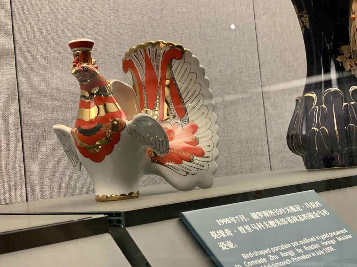 據(jù)現(xiàn)場(chǎng)工作人員介紹,俄羅斯皇家瓷器是彼德大帝的女兒伊里沙白女王興建,已經(jīng)擁有長(zhǎng)達(dá)275年的歷史。與德國(guó)梅森、英國(guó)皇家德比共稱世界三大皇家御用瓷器。1998年,俄羅斯外長(zhǎng)訪華時(shí)曾將這一描金鳥形瓷壺作為國(guó)禮送給朱镕基總理。