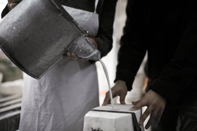 11月12日,在福建德化明華陶瓷藝術(shù)研究所,陳明華(左)和兒子張國(guó)暉在向模具灌漿,凝固成型后就可以進(jìn)行燒制。