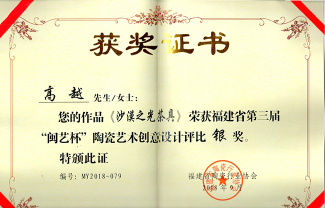 2011年 陶藝作品《禪茶一味》在第三屆福建省陶瓷藝術(shù)與設(shè)計(jì)創(chuàng)新比賽中獲得 銀獎(jiǎng)。