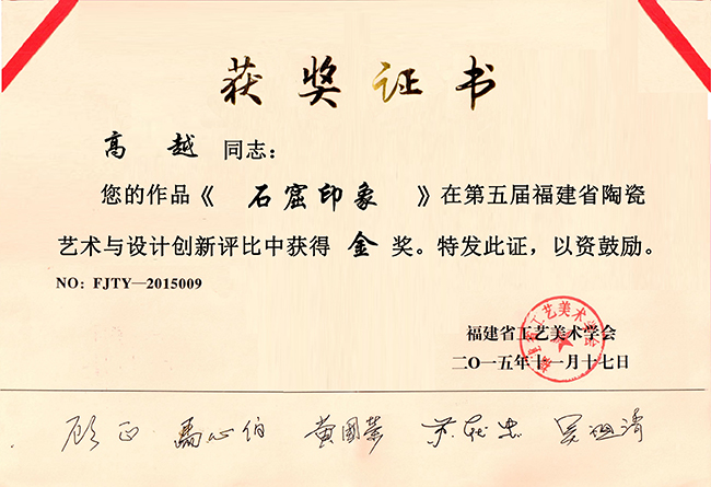 2015年 陶藝作品《石窟印象》在第五屆福建省陶瓷藝術(shù)與設(shè)計(jì)比賽獲得 金獎(jiǎng)。