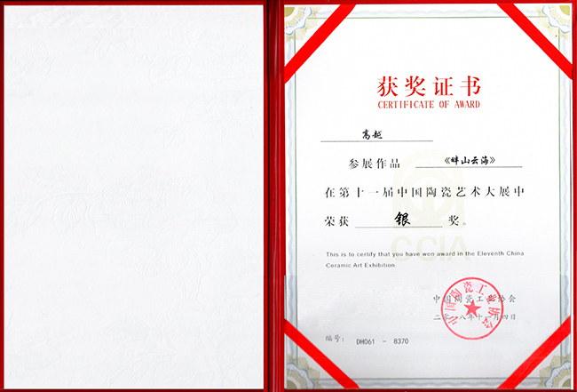 2016年 陶藝作品《畔山云海》在設(shè)計(jì)中國(guó)第三屆中國(guó)當(dāng)代陶瓷設(shè)計(jì)大賽中獲得 優(yōu)秀獎(jiǎng)。
