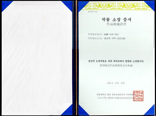 2012年 陶藝作品《憶江南》被韓國(guó)江源大學(xué)永久收藏。