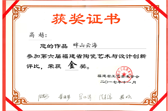 2017年 陶藝作品《畔山云!吩诟=ㄊ√沾伤囆g(shù)與設(shè)計(jì)創(chuàng)新比賽,榮獲 金獎(jiǎng).
