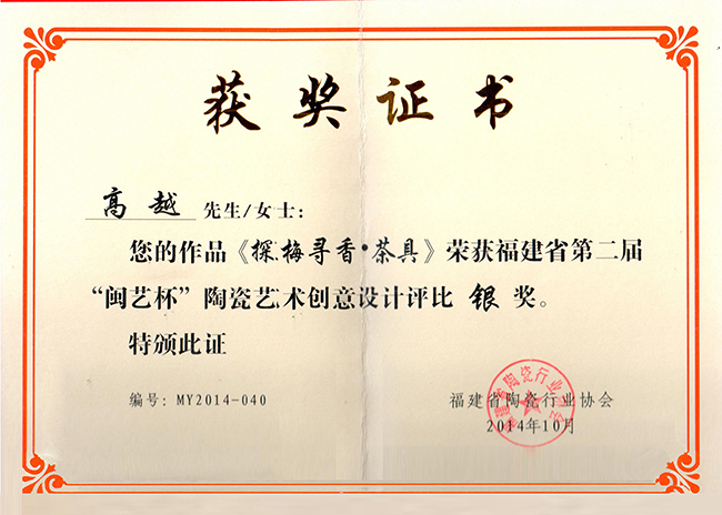 2014年 作品《探梅尋香》茶具在福建省第二屆“閩藝杯”陶瓷藝術(shù)創(chuàng)意比賽獲 銀獎(jiǎng)。