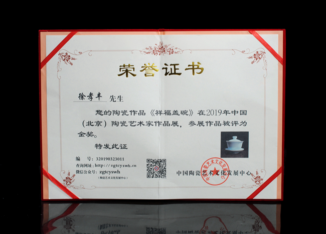 《祥福蓋碗》在2019年中國(北京)陶瓷藝術(shù)家作品展,參展作品被評為金獎