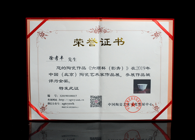 《六順杯(影青)》在2019年中國(北京)陶瓷藝術(shù)家作品展,參展作品被評為金獎
