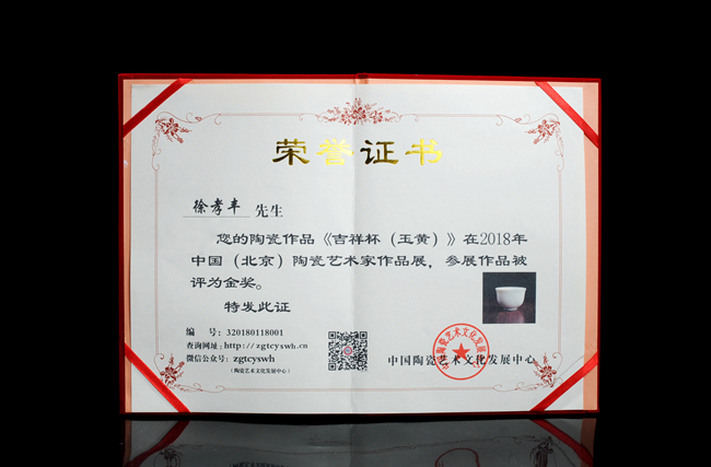 《吉祥杯(玉黃)》在2018年中國(北京)陶瓷藝術(shù)家作品展,參展作品被評為金獎