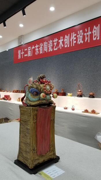 廣東省陶瓷藝術(shù)大師、佛山市工藝美術(shù)學(xué)會(huì)副會(huì)長(zhǎng)兼秘書(shū)長(zhǎng)周永鏘此次從佛山帶來(lái)了十多位作者的30件陶塑作品,作者涵蓋多名中國(guó)陶藝大師和省級(jí)大師,包含有人物、動(dòng)物等多個(gè)類(lèi)別,每件都是作者今年創(chuàng)新作品,也代表了當(dāng)?shù)靥账芄に嚾宋木窈同F(xiàn)今石灣陶藝發(fā)展的方向。其中這樽獅頭陶器是周永鏘的作品,作品頂部以南方扎作獅頭作為題材,下方以傳統(tǒng)傢俬百子柜作襯托,獅頭目光炯炯有神,長(zhǎng)須下飄,靜中有動(dòng),不怒而威。(鄒錫蘭 梁嘉慧)