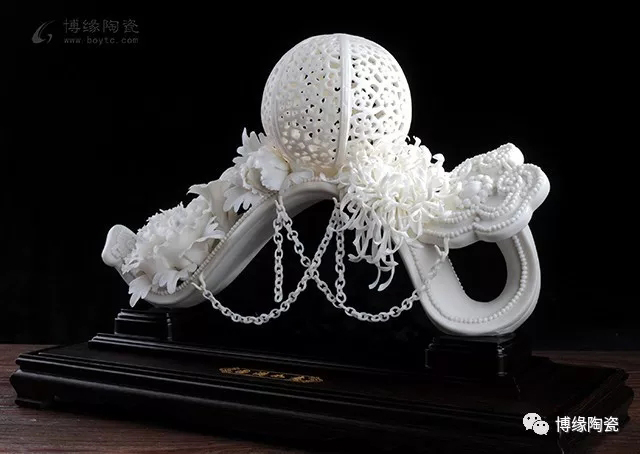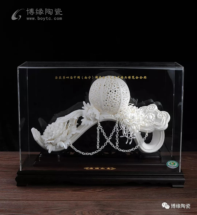 《圓滿如意》以如意棒為主體,圓球修飾圓滿,瓷花來襯托柔軟鏈條的動感,以柔至剛,松密結(jié)合,形成涌形構(gòu)圖。作品以德化特有的溫潤如玉的“中國白”為胎質(zhì),潔白細(xì)膩,素凈淡雅。純手工制作,造型獨特,瓷質(zhì)白如玉,滑如脂、晶瑩碧剔。作品具有很高的欣賞價值與實用裝飾價值。2013年《圓滿如意》被福建工藝美術(shù)館珍藏。
