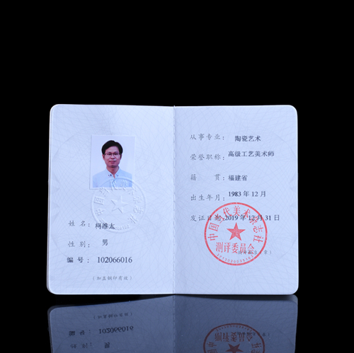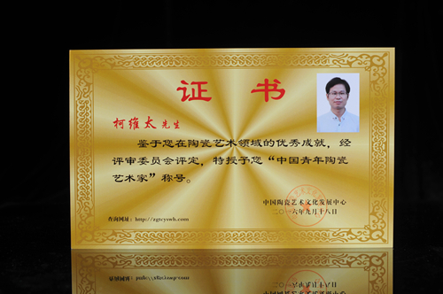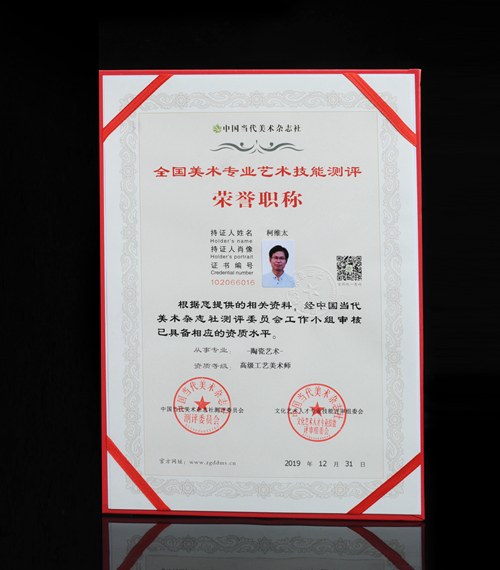近日,中國青年陶瓷藝術(shù)家柯維太,通過了中國當(dāng)代美術(shù)專業(yè)藝術(shù)測評委員會評測,榮獲“高級工藝美術(shù)師”。