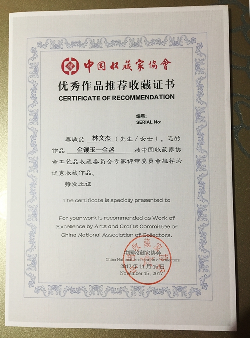 2017年11月15日作品《羊脂玉品沉香套裝》被中國收藏家協(xié)會評為“特別推薦收藏作品”