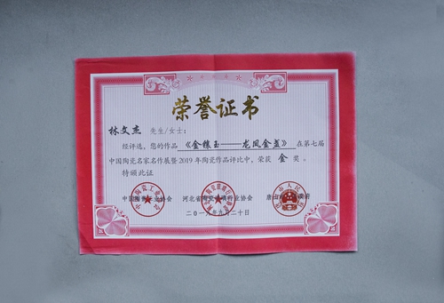 2019年9月20日作品《金鑲玉-金盞》在第七屆中國陶瓷名家名作展暨2019年陶瓷作品評比中榮獲金獎