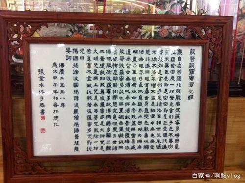 現(xiàn)在來到大堂的右邊,在這個(gè)墻壁上掛了一幅畫,這一幅就是明代何朝宗的陶瓷作品真跡,叫做渡海觀音,它是我們目前整個(gè)中國德化白瓷的一個(gè)經(jīng)典,據(jù)說這一幅現(xiàn)在市場價(jià)值可以達(dá)到千萬,整個(gè)全世界只有5幅,那目前這一幅是存留在泉州海外,海外交通史館也是國家一級(jí)文物,那它的作者何朝宗,就是泉州德化人,非常的厲害,然后在畫作的下面,有一個(gè)應(yīng)該叫做紙筒,然后在這個(gè)也是整個(gè)桶全是用陶瓷做成的,在這個(gè)桶的外壁寫上了密密麻麻的毛筆字,據(jù)說這個(gè)是我們?nèi)莸禄?dāng)?shù),?dāng)代最著名的一位陶瓷書法大師,這些毛筆字全是他親手寫上去的,作者叫張金水,親自用手一字一字寫上去,寫滿整個(gè)陶瓷,也成千字文。