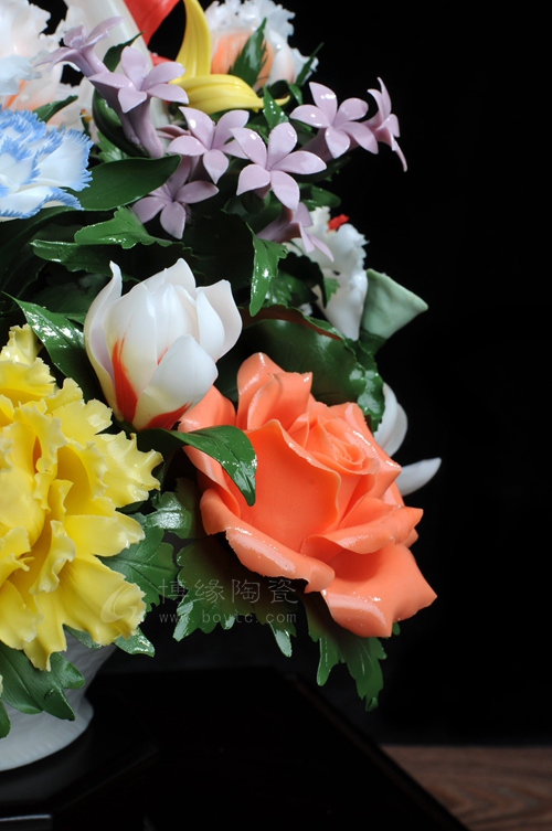 作品沿用德化傳統(tǒng)的制瓷技法“捏、塑、雕、鏤、貼、接、推、修,作品集合牡丹、玫瑰、菊花等盡顯出百花爭(zhēng)艷的姿態(tài),呈現(xiàn)出花開富貴的一番景象,瓷花純手工捏制,細(xì)膩精致、以假亂真。體現(xiàn)出創(chuàng)作者匠心獨(dú)具。