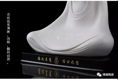 早在明代德化白瓷佛像就名聲在外,一代“瓷圣”何朝宗佛像名作流傳后世,成為世界各大博物館收藏的珍品,更對佛像雕塑史上產(chǎn)生深遠的影響,形成“何派”雕塑,其開創(chuàng)的捏、塑、雕、刻、刮、削、接、貼八字技法延用至今。何派觀音雕塑注重于細節(jié)之美,精益求精,故而十分著意衣紋的刻畫,使線條流暢,翻轉(zhuǎn)自然。觀其佛像,仿佛有春風(fēng)拂面,衣袂飄揚的出塵之感。