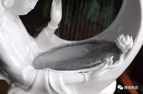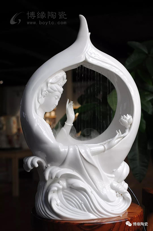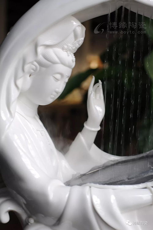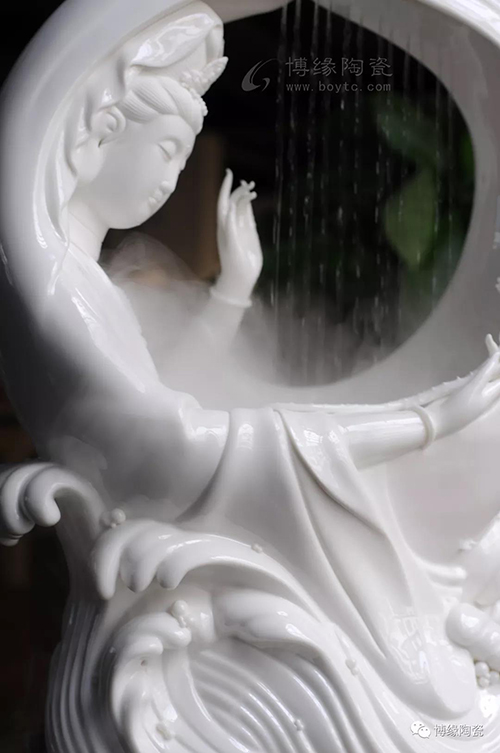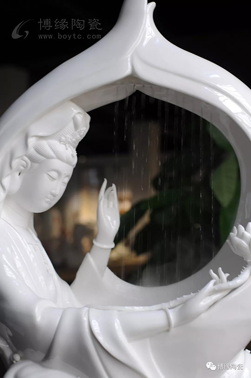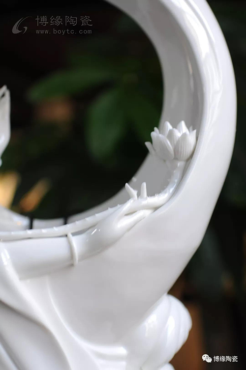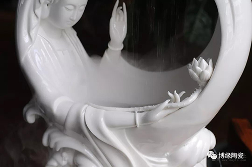 《蓮花觀音》以徳化白瓷為胎貭,圜劭有カ如凝脂似玉,觀音衣服的皺褶刻畫得猶如飄動的感覺,表現(xiàn)極具細膩完美,中間凹槽設計加濕功能,煙霧繚繞,猶如仙境,再現(xiàn)了高超的工藝和匠心獨具的藝術(shù)構(gòu)思,使作品具有非凡的神韻,充分體現(xiàn)了觀音濟世之神的神采,更體現(xiàn)出極富濃郁的東方文化底蘊和深邃的宗教文化。作品銭條清晰、筒浩、瀟灑,多変化,柔媚流暢,翻裝自然,神情嫻雅平靜,安洋自若,雙目低垂凝思。面部刻刻細膩,衣紋則深而洗蘇,主次分明。