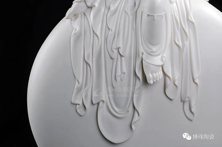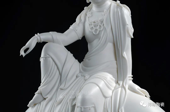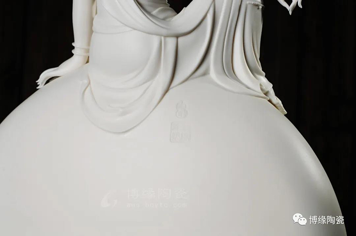 早在明代德化白瓷佛像就名聲在外,一代“瓷圣”何朝宗佛像名作流傳后世,成為世界各大博物館收藏的珍品,更對佛像雕塑史上產(chǎn)生深遠的影響,形成“何派”雕塑,其開創(chuàng)的捏、塑、雕、刻、刮、削、接、貼八字技法延用至今。何派觀音雕塑注重于細節(jié)之美,精益求精,故而十分著意衣紋的刻畫,使線條流暢,翻轉(zhuǎn)自然。觀其佛像,仿佛有春風(fēng)拂面,衣袂飄揚的出塵之感。