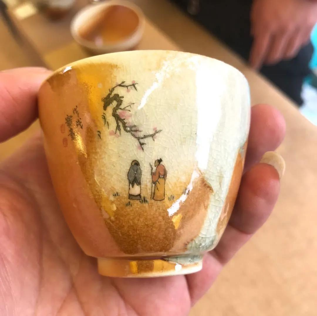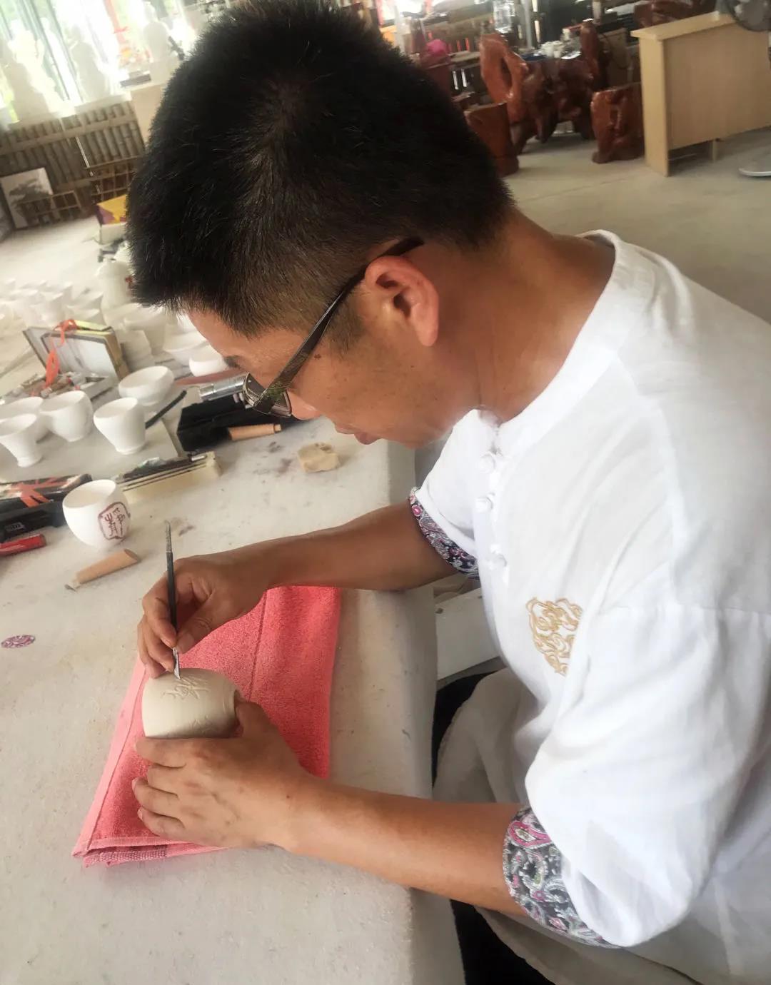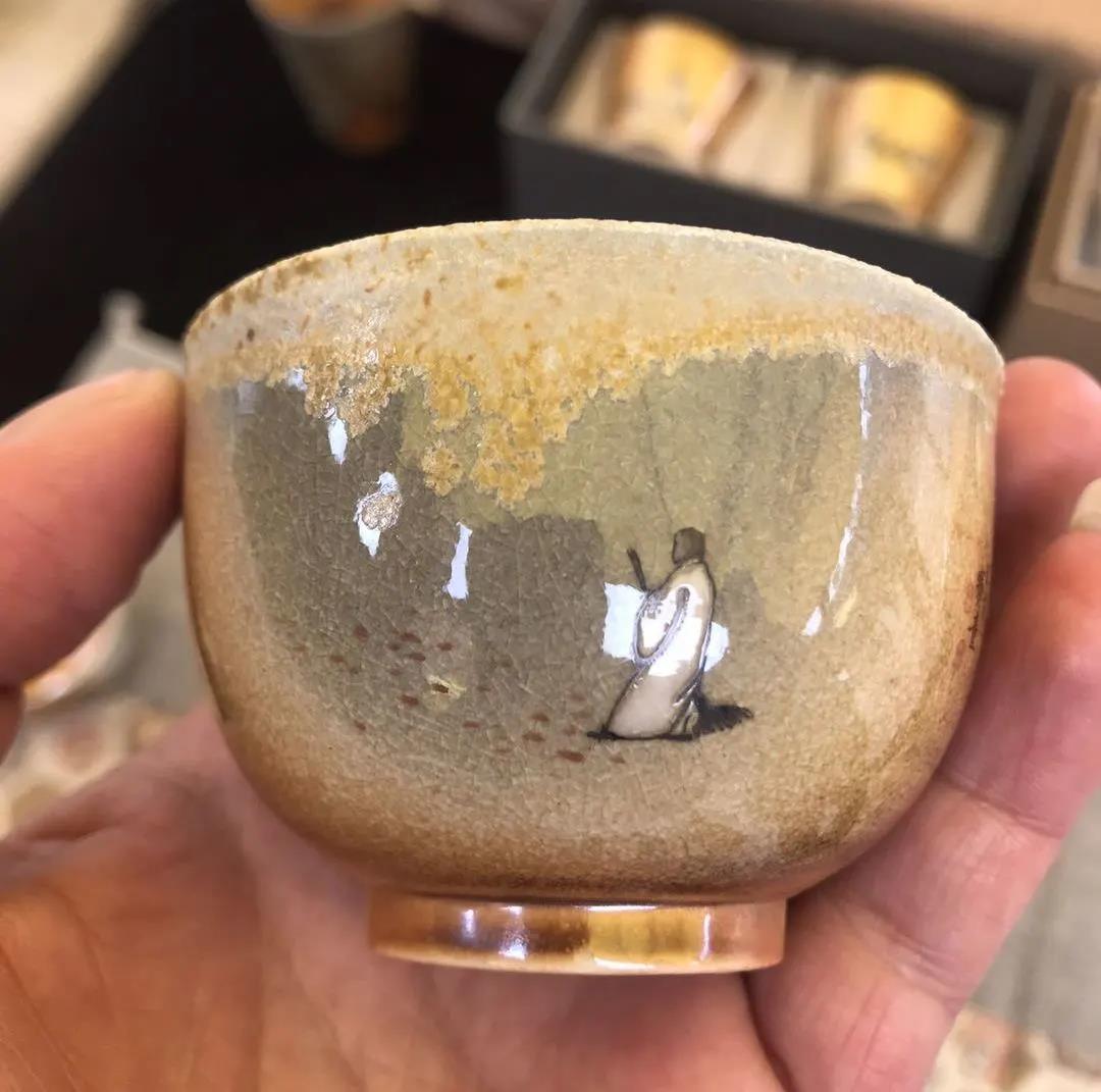 在這里,筆者看到了張移峰與眾不同的柴燒。除了火痕、落灰、釉面變幻這些共性,筆者關(guān)注到這里的柴燒多了一縷詩情畫意,器皿上一幅幅別出心裁的小畫讓古樸的作品多了別樣的風(fēng)情。在柴燒器皿上作畫,張移峰是德化第一人,這也成為他獨特的標簽。