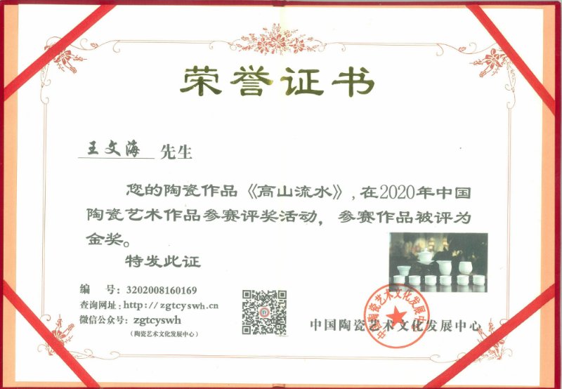 王文海經(jīng)過多年配方研究,成功配方出珞月翡玉瓷,其是當(dāng)今高端白瓷上品,瓷質(zhì)地、光澤近似 翡玉,珞月翡玉瓷需精選上好高嶺土,其每噸原泥料高達(dá)50000多元,經(jīng)過70多道工序制作,并且其 瓷需經(jīng)過1350多度高溫?zé),瓷質(zhì)白、潤、透,是不可多得的上品。