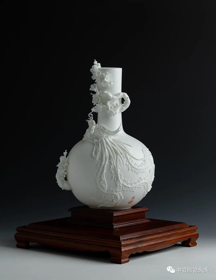 作品應(yīng)用“瓷線雕”的裝飾技法與德化傳統(tǒng)的捏塑工藝,在瓷瓶上裝飾出鳳梅圖案,立體生動(dòng),寓意美好。純手工捏制的梅花與瓷線勾勒成型的鳳凰,精巧別致,令人眼前一亮。