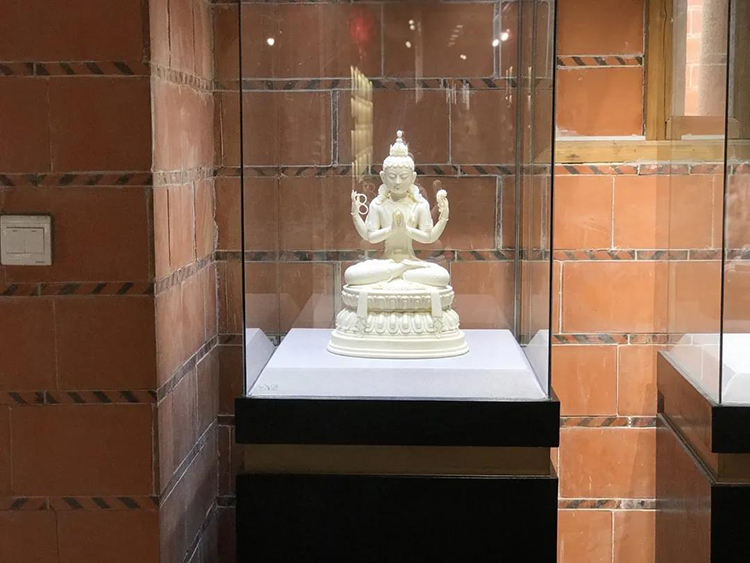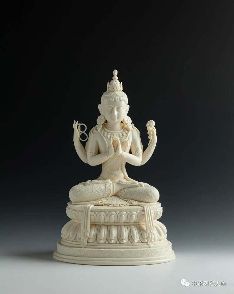 該作品是在嚴(yán)格遵循《造像度量經(jīng)》規(guī)矩下,應(yīng)用德化傳統(tǒng)瓷塑技藝創(chuàng)作的藏傳佛教造像,每一毫米的尺寸都需要精準(zhǔn)把控。獨(dú)自研發(fā)的玉黃瓷土材質(zhì),令作品仿若象牙材質(zhì)般溫潤(rùn)如酥油。從頭飾到腳飾,繁多的細(xì)節(jié)雕刻,可見(jiàn)作者精湛的雕刻功底。