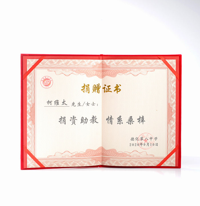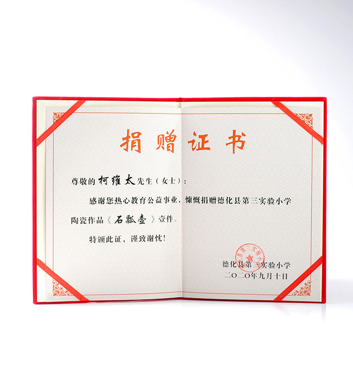 由德化縣教育局楊光照副局長(zhǎng)為中國(guó)青年陶瓷藝術(shù)家柯維太頒發(fā)《捐贈(zèng)證書(shū)》。