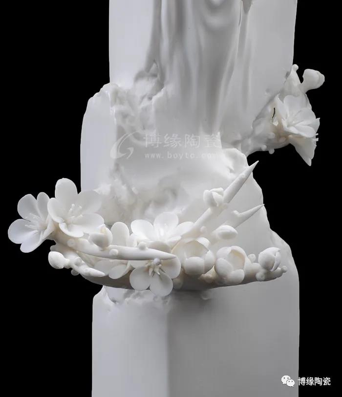 梅”與“眉”同音,故又作“喜上眉梢”,描述人逢喜事,神情洋溢的樣子。作品可見女子坐于巖石梅梢之上,人物端莊,神態(tài)優(yōu)雅,嘴角流露出一絲微笑,整件作品唯美,富有詩意,手工捏制梅花尤顯精致。