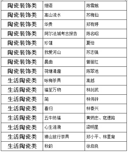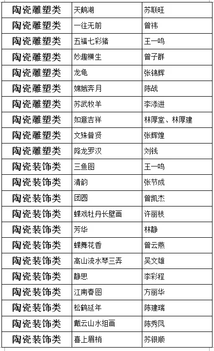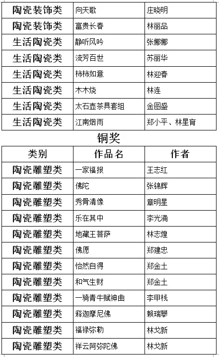 12月6日,福建省工藝美術(shù)學(xué)會“第七屆福建省陶瓷藝術(shù)與設(shè)計創(chuàng)新評比”在泉州工藝美術(shù)職業(yè)學(xué)院評比揭曉。 據(jù)了解,大賽由福建省工藝美術(shù)學(xué)會主辦,福建省工藝美術(shù)學(xué)會陶瓷藝術(shù)專業(yè)委員會承辦,一共有陶瓷雕塑類、陶瓷裝飾類、生活陶瓷類三大評比類別。 本次大賽共評出金銀銅獎項共142件(套),F(xiàn)通告如下: